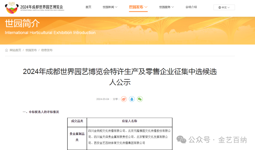 3月4号上午,成(chéng)都(dōu)園藝博覽官網發(fā)布了2024年成(chéng)都(dōu)世界園藝博覽會(huì)特許生産及零售企業征集中選候選人公示,西安金藝百納文體集團榮幸獲得貴金屬類、玩具類、工藝品類、陶瓷制品類的官方特許産品生産與零售。